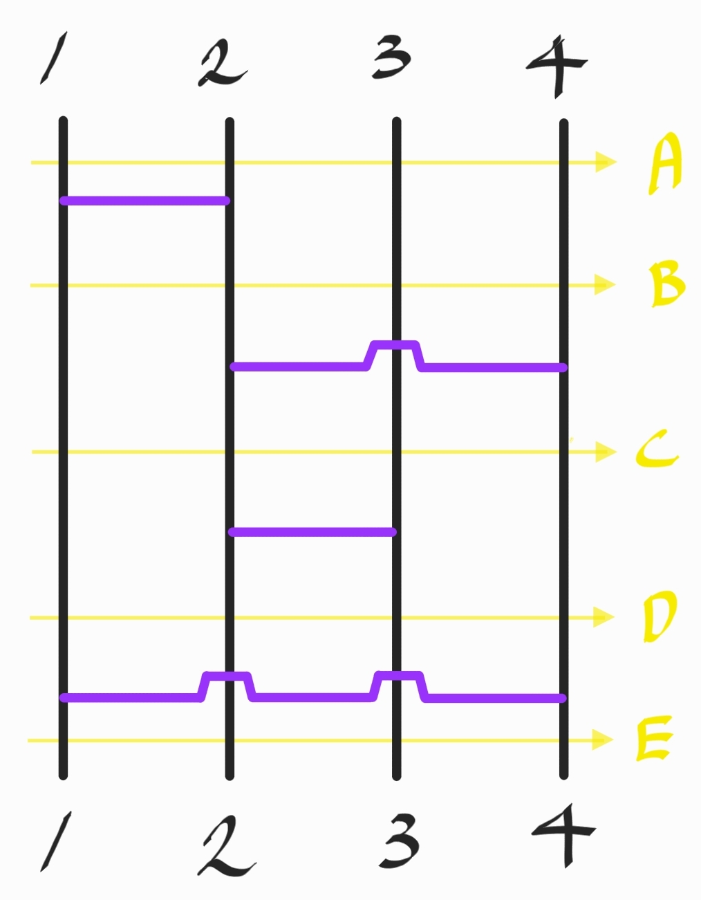 위 사진의 E 상태는 직전에 1번 사다리와 4번 사다리를 이은 가로 이음선이 생긴 상태이다. 따라서 dp[k][1], dp[k][4] ( 1 <= k <= N ) 을 모두 업데이트를 해야 한다. 또한 여기서 구하는 dp 의 값들이 최종 dp 값이 된다.