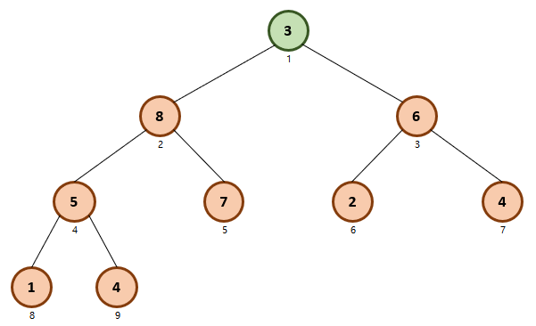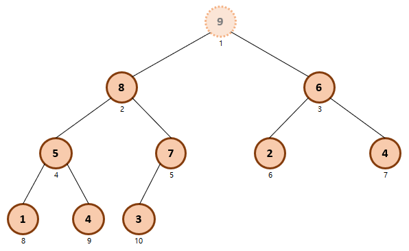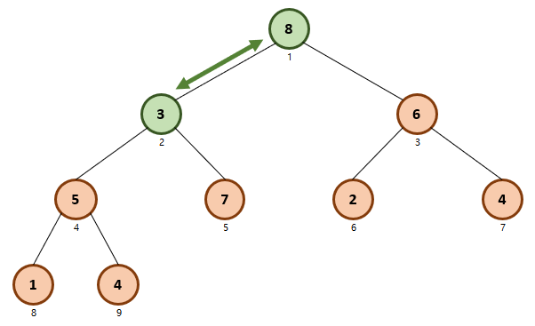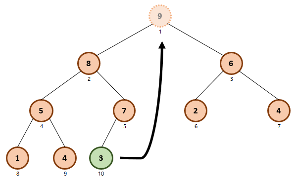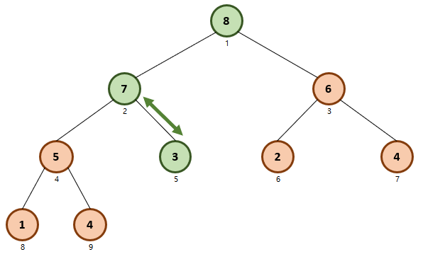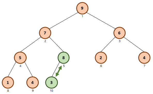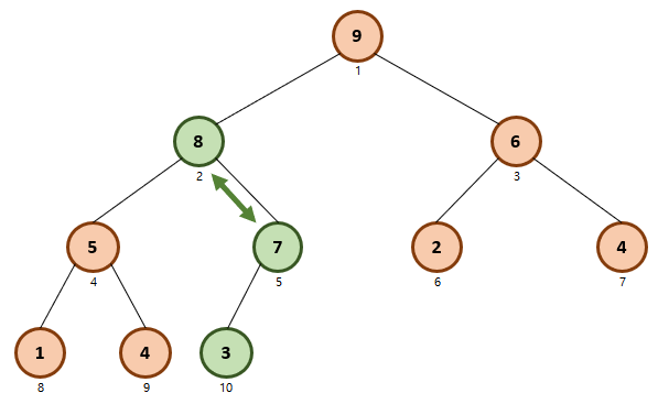 위와 같이 두 Node의 Swap이 이루어졌다. 그리고 2번째 Node로 이동이 된 Node는 또 다시 자식 Node들과 값을 비교한다. 2번째 Node는 아래 두 자식노드들보다 작은 값을 가지고 있다. 따라서 아까와 마찬가지로 두 자식노드들 중 더 큰 값을 가지는 자식 Node와 Swap을 한다.