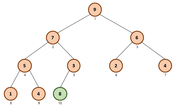 10 번째 Node 에 삽입이 된 data 8 은 부모노드의 값보다 크다. 따라서 이와 같이 두 Node 의 Swap이 이루어졌다. 그 결과 삽입된 Node는 현재 5번째 Node 에 있다.