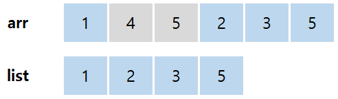 그 결과, list 는 위와 같이 정의가 되었다. arr 에서 파란 부분들이 list 에 대입이 되어 있는 상태이다. 위와 같은 경우는 우연찮게 arr 에서 가장 긴 증가하는 부분 수열이 list 에 대입이 되었다. 하지만 이는 말 그대로 우연일 뿐이다. 마지막 3, 5 숫자가 arr 에서 없다면, list 에는 {1, 2, 5} 가 대입이 되어있었을 것 이다.