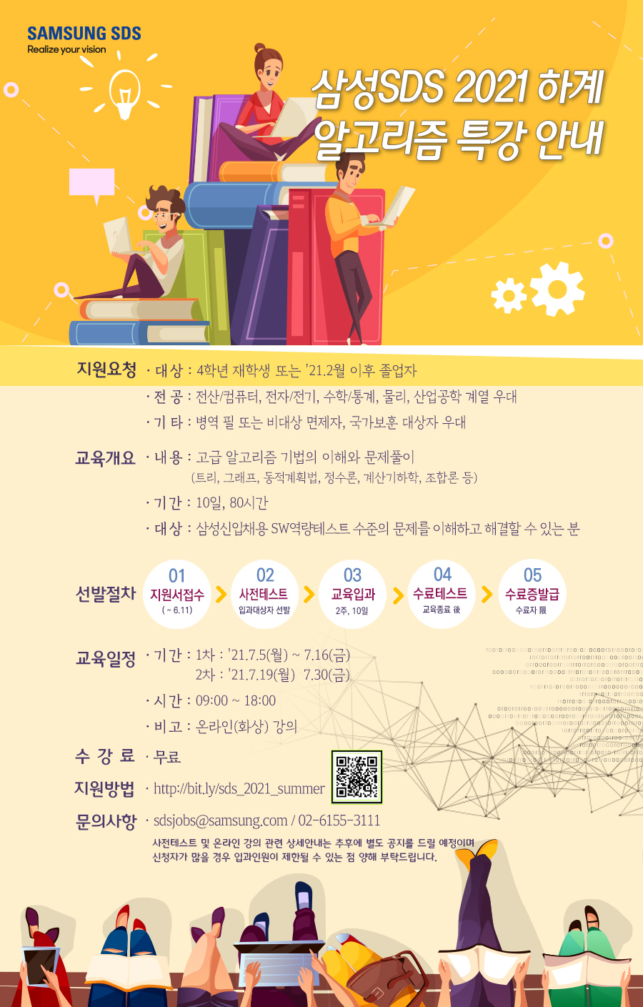 2021년 6월 11일 금요일까지 삼성SDS 에서 2021년 하계 알고리즘 특강 지원을 받았다. 7월 중순까지는 계절학기를 들었어야 해서 2차수로 지원을 해 보았다. (지원을 할 땐 병적증명서, 재학증명서, 성적증명서, 전공증명서류를 제출 해야 했었다!)지원을 하면 무조건 들을 수 있는 것이 아니라 지원자가 교육과정에 있는 문제 및 이론들을 이해할 수 있는지 확인을 하기 때문에 지원서 마감 후 코딩테스트를 보았다. 코딩테스트는 6월 16일 수요일 오전 9시부터 6월 20일 일요일 자정까지 5문제를 풀면 됐다. 4.5일 정도 안에 5문제를 풀면 됐기 때문에 주어진 시간상 5문제를 다 푸는것은 무리는 없을 것 같았다. 하지만 "각 문제는 2~3시간 이내에 푸는 것을 권장" 하였다. 주어진 시간 내에 잘 해결하는 모습을 확인하고자 한 것 같다.