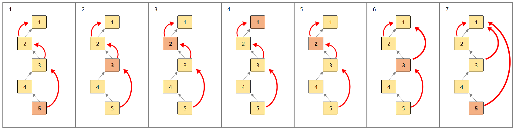 Find 함수는 입력으로 들어온 노드의 루트 노드를 리턴한다. 또한 부모 노드의 부모 노드를 계속해서 탐색하여 루트 노드에 도달하면서, weight 배열도 업데이트를 해 준다. 재귀를 통해 처음에 입력된 노드의 루트 노드까지 이동을 한 후 그 때 부터 그 노드의 parent값과 weight 값을 계속해서 업데이트를 하고, 최종적으론 처음에 입력된 노드의 parent 값과 weight 값이 업데이트가 된다. 아래 Find(5) 를 할 때 노드들의 parent 값의 업데이트를 표현 해 보았다.