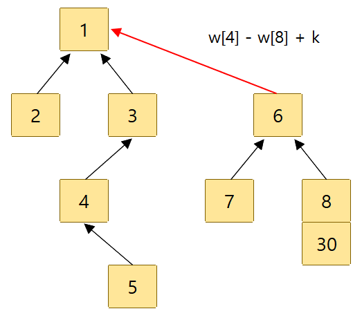 이와 같은 경우에서 8번째 샘플이 4번째 샘플보다 k 만큼 무겁다고 데이터가 들어왔다고 하자. 두 트리의 샘플(노드)끼리 비교를 하는 상황인 경우에는 결국 weigth[4] 에는 4번째 샘플과 1번째 샘플의 무게 차, weight[8] 에는 8번째 샘플과 6번째 샘플의 무게 차 값이 저장되어 있으므로 이 세 데이터를 통해 1번째 샘플과 6번째 샘플의 관계를 알 수 있다.