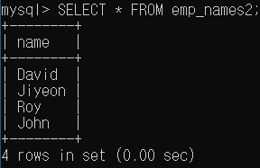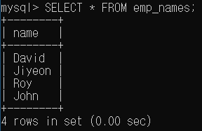 emp 테이블의 name COLUMN data들을 emp_names 테이블에 INSERT 하게 된다. 그러면 emp_names 테이블에는 아래와 같이 data들이 삽입 되어있게 된다.