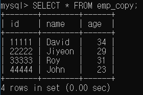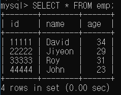 위와 같은 테이블을 생성한 뒤 4개의 데이터를 집어 넣었다. emp 테이블에는 아래와 같이 data들이 들어있게 된다.