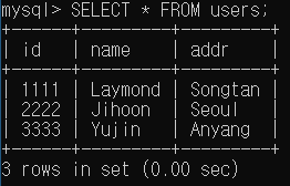 Primary Key 값이 겹치는 경우에는 name 을 'Laymond'로, addr 을 'Songtan'으로 UPDATE 해 달라는 의미이다. Primary Key 값이 겹치지 않는 경우에는 UPDATE 가 실행되지 않는다. 위와 같이 실행을 한 뒤 users 테이블의 data들은 아래와 같다.