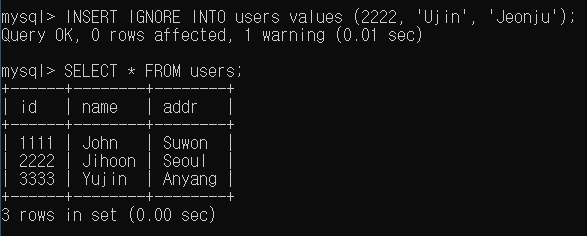 INSERT IGNORE INTO users values (2222, 'Ujin', 'Jeonju');