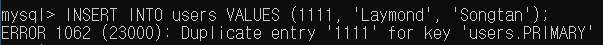 위와 같이 테이블 생성 및 data INSERT 를 하였다. 당연히 알고있는 것 이지만 중복되는 id값을 가지는 data의 삽입은 아래와 같이 불가능하다.