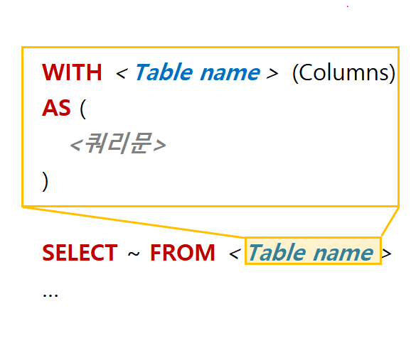 위 쿼리는 WITH 절을 통해 'A' 부서에 속한 사원들의 id, name, salary 로 CTE_dept_1 라는 테이블 임시로 만든 것 이다. WITH 절을 이용하여 비재귀적 CTE를 만드는 형식은 아래와 같다.