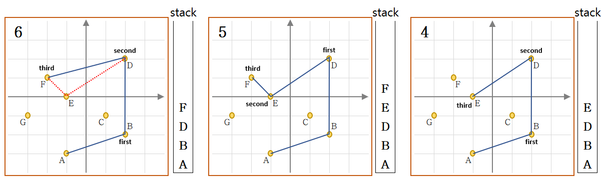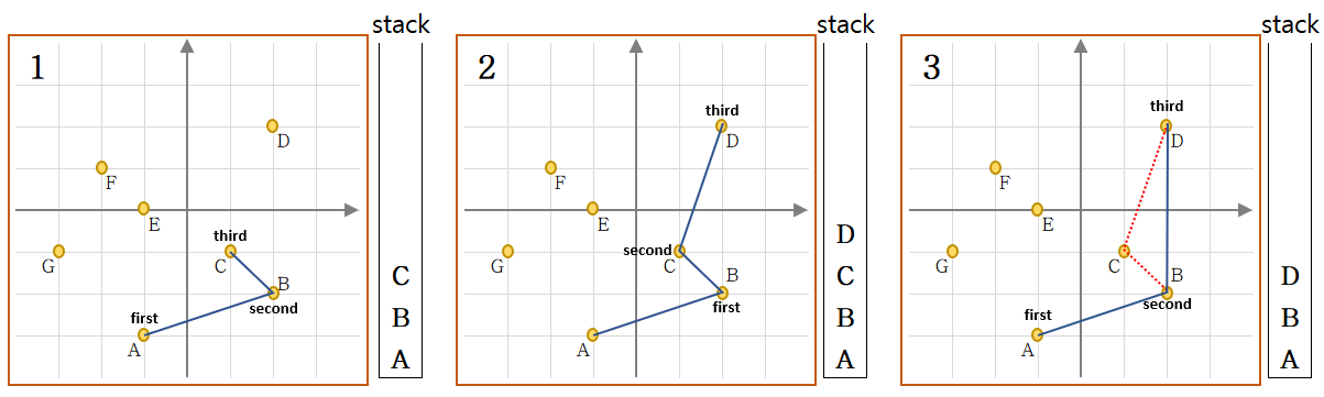 - Stack 에는 볼록 다각형을 형성하는데 필요한 점들이 들어가게 된다.