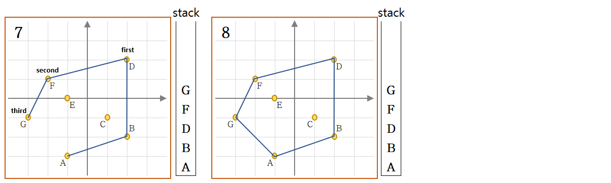 다각형에 포함이 되는 점은 Stack 에 쌓이게 된다. 이 때 3, 6번째 같은 상황에 대해 고려를 해야한다. first, second, third 점을 A, B, C 라고 했을 때 아래 두 케이스가 존재한다.