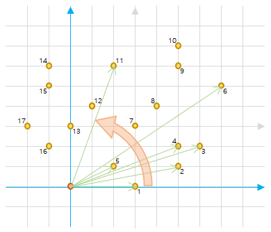 - 주황색 화살표와 같은 순서로 반시계 방향으로 점들을 정렬한다. 각 점 옆에 쓰여져 있는 숫자가 정렬되는 순서이다.