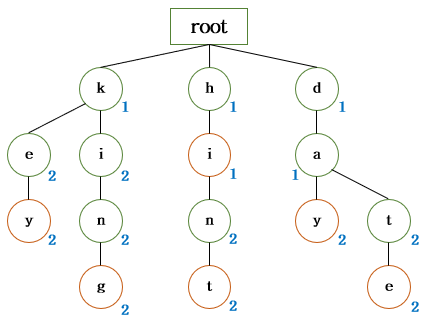 각 Node 의 옆에 파란 숫자는 그 글자까지 나오기까지 키보드를 누른 횟수이다. 또한 빨간 테두리 Node 는 단어의 끝을 알리는 Node 이다.