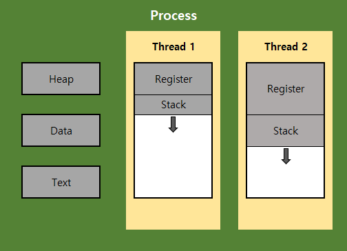 1. 한 프로세스의 Heap, Data, Text 영역 모든 스레드들이 공유하는 메모리 이지만 Register, Stack 영역은 각 스레드마다 독립적으로 부여되어있다.