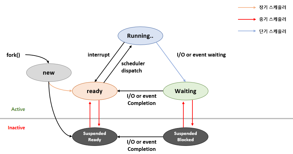 - 너무 많은 프로세스에게 물리 메모리(Phsical Memory)를 할당한 경우 여유 공간을 마련하기 위해 프로세스를 통째로 메모리에서 디스크로 쫓아낸다. 쫓아진 프로세스는 Suspended 상태라고 불리우며 전부 Disk에 존재하게 된다. 중기 스케줄러 또한 요새 쓰이는 가상 메모리(Virtual Memory) 덕분에 쓰이지 않는 스케줄러이다.