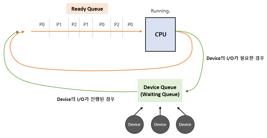 - Device Queue는 Device가 여러개 이기 때문에 여러개가 존재할 수 있다. I/O나 interrupt 를 기다리는 프로세스들이 존재하는 큐이다.