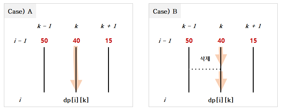 Case) B : dp[i][k] = dp[i][k], dp[i - 1][k - 1] + delete_cost ;