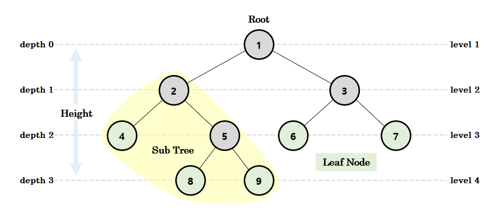 - Sub Tree : 트리에서, 임의의 노드를 Root 노드로 삼았을 때 구성되는 또 다른 이진 트리