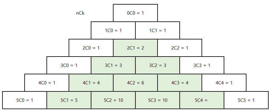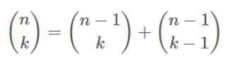 좌측의 수식과 같은 이항계수의 값을 구할 때 사용할 수 있다. 하지만 아래 설명을 보면 알 수 있듯 점화식을 활용한 Dynamic Programming의 알고리즘을 사용하는 형태로, n의 값이 상당히 커진다면 사용하기 곤란한 알고리즘이다.