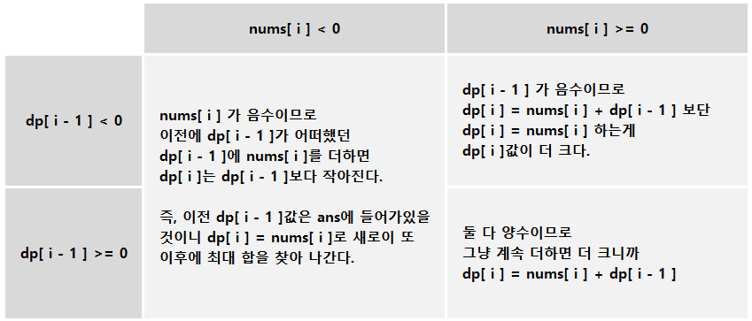 결국, 이 경우들에 대해선 모두 dp[ i ] = nums[ i ] 아니면 dp[ i ] = nums[ i ] + dp[ i - 1 ] 이 됨을 알 수 있다. 따라서 dp[ i ]의 값은 위 코드 24번째 line 과 같이 max(nums[ i ], nums[ i ] + dp[ i - 1 ]) 가 된다.