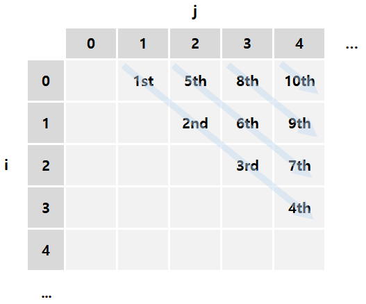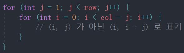 사선으로 DP를 진행하기 위한 nested for loop는 아래와 같은 형태로 짰다.