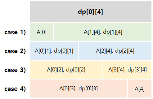 4개의 case 들 모두 두 개의 블록으로 나누어져 있다. case1의 왼쪽 블록, case4의 오른쪽 블록을 제외하곤 그 블록에 대한 dp[ i ][ j ]값은 이미 구해져 있는 상태이다. 즉 case마다 이미 구해져있는 dp값에 두 블록을 연결하면서 (두 행렬을 곱하면서) 드는 곱셈의 연산 횟수를 더해주면 구하고자 하는 dp[0][4]값이 된다.