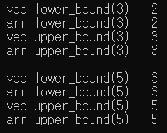 만약, 위 벡터에서 lower_bound(4) 를 하면 4에 해당하는 index 값이 없으므로, upper_bound(4)와 같은 결과를 낸다.