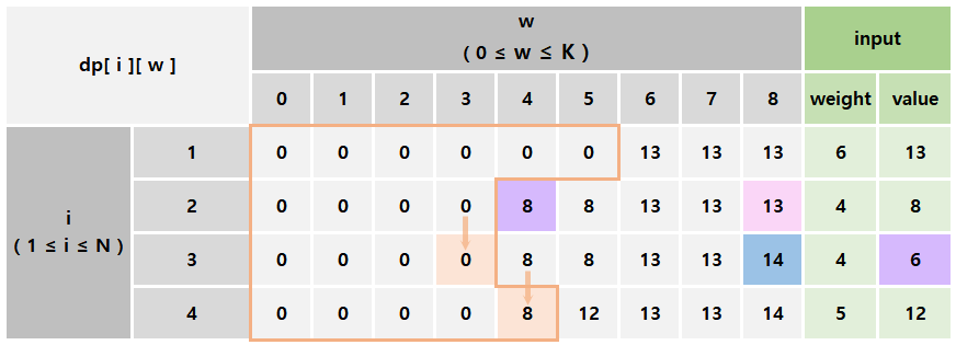 loads[ i ]의 무게 > w 이면 이 짐 하나 챙기는 것도 못 하므로 이 짐은 무시된다. 따라서 이 짐은 있으나 마나 이므로 이 짐이 없을때의 dp값이 이 경우의 dp값이 된다. 위 그림의 주황색 테두리 안에 있는 dp[ i ][ w ] 들이 이에 해당한다. 주황색 칸과 화살표를 통해서 직관적으로 나타내 보았다.