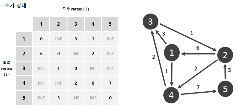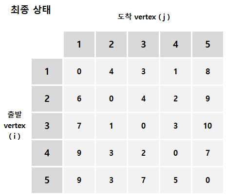 - 첫 번째 for문 에서 경유하고 갈 vertex를 지정한다.